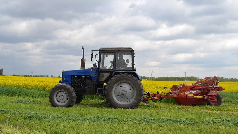 Были представлены кормозаготовительные комплексы, косилки (в том числе косилка-плющилка «Палессе» СТ42, которую на снимке тянет трактор), универсальное энергосредство и другие машины. С помощью СТ42 был продемонстрирован один из способов заготовки кормов на поле, где практикуется полосной способ сева озимой вики (сурепицы) и озимых зерновых культур. Первый травяной урожай на нём планируют собрать уже во второй декаде мая. Затем на этом же поле после внесения органических удобрений «поселятся» однолетние травы или кормовые культуры. Данную технологию, которую в «Михайловском-Агро» практикуют три года, Валентин Гракун рекомендовал перенять другим регионам Гомельщины. Главная задача, поставленная Президентом Беларуси Александром Лукашенко, — обеспечить полуторагодичный запас травяных кормов.